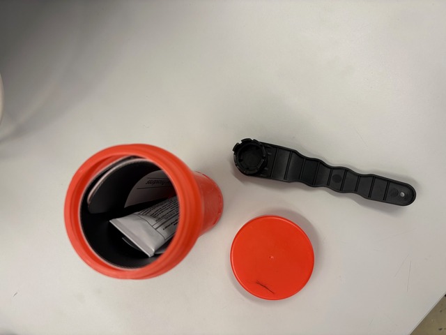 Tartalma: ragasztó 30 g, 1 db szürke és 1 db fekete 15x22 mm-es PVC anyag, és szelepkulcs. A szelep kulcs törött.