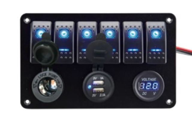 Részletes leírás:6 automata biztosítékkal ellátott kapcsolópanel,kék visszajelző leddel. Digitális voltmérővel 30V-ig, 6x20A vagy 6x10A biztosíték. 2 USB (1x USB 5V 1A 1x USB 5V 2.1) Méretek:182x100mm.Fröccsenő víz ellen védett.