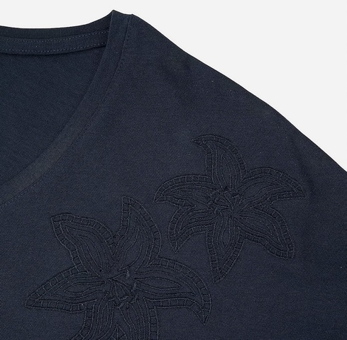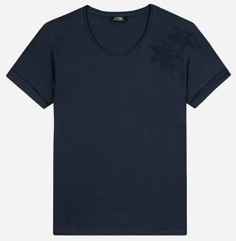 Részletes leírás:A TBS Nadeatee női, kerek nyakkivágású póló, rövid ujjú., bal váll részén virág mintával. Anyaga 100% pamut.