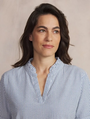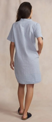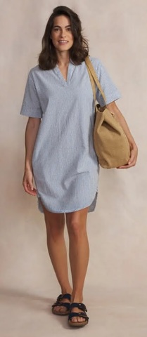 Részletes leírás:A TBS Babetrob egy női zsákruha, Középkék/fehér csíkos. Pamut anyagból, V nyakkivágással, rövid ujjal.