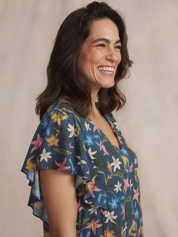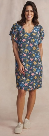 Részletes leírás:A TBS Gyselrob egy női zsákruha. Kék alapon, színes virág mintákkal. Pamut anyagból, V nyakkivágással, rövid, ejtett ujjal.